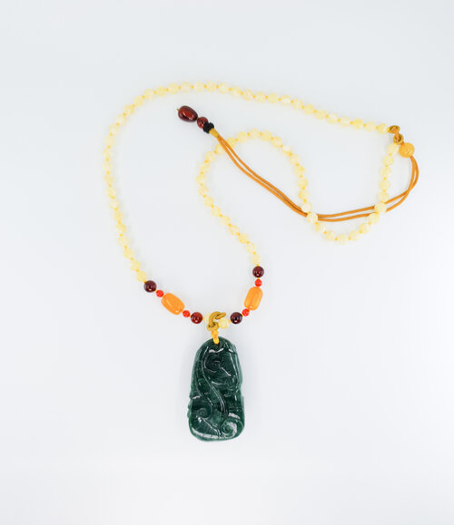 Be the first to review “Hunter Green Jadeite with Phoenix Engraving and Amber Beads Necklace” Cancel reply